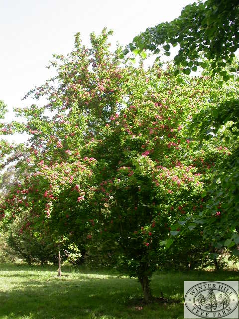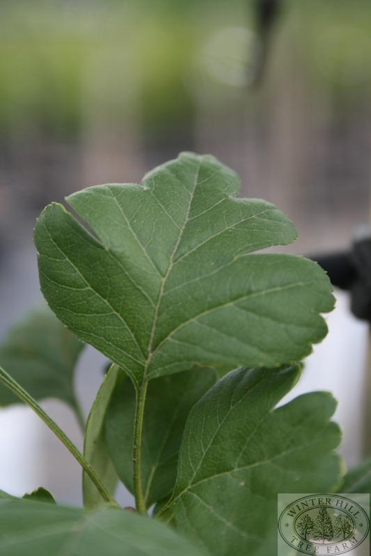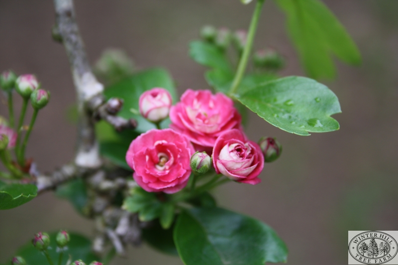 Deciduous small tree with spreading habit. Dark, glossy green foliage with five distinctly round lobes. Produces masses of tiny, double scarlet flowers in tight clusters along the branches in late spring, and in autumn leaves colour burnt orange and burgandy. Has minimal thorns. A very hardy tree,adaptable to almost any well-drained location, including clay soils but prefers a lime rich soil and dislikes extremely dry conditions. Suitable for street planting, hedging or as a specimen.